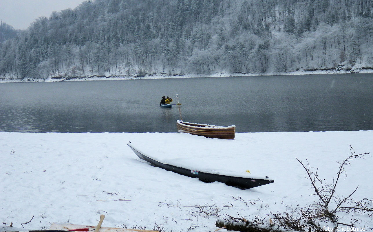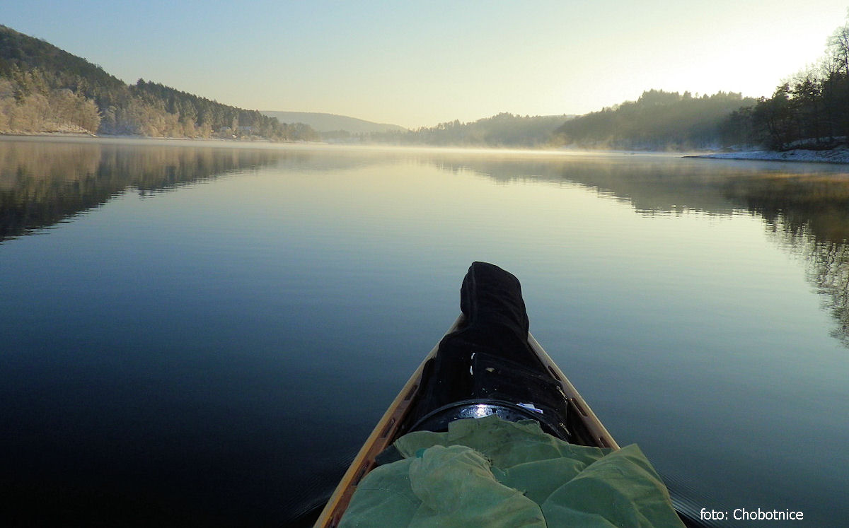Třetí pátek v lednu už jsem měl sbaleno vše potřebné a vyrazil do Třebenic. Tady je pohodlná náplavka, kde lze dát loď na vodu. Však zde začíná i seakajakářská akce Zimní Slapy. Stará dobrá Cedrofka měla větší ponor než obvykle, ona zimní tábornická výbava plus zlatokopecké náčiní a pár drobností jako palice a štípací klíny něco váží. Ale v tom je kouzlo cestování po vodě, že pokud nejsou přenášky, bagáž vás netíží. I vyrazil jsem vstříc zlatým polím.