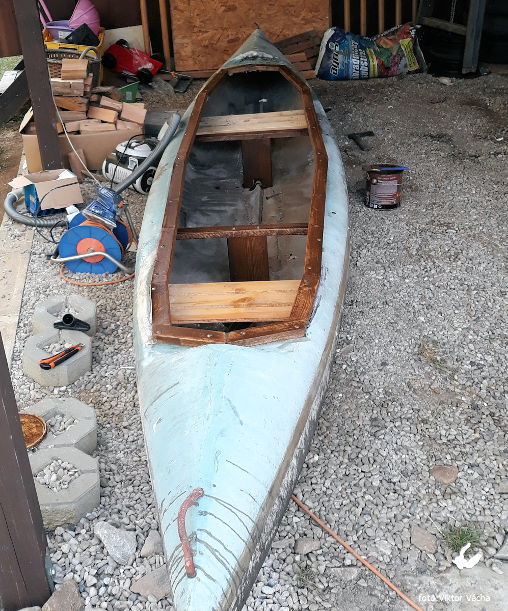 Situace první. Kamarád nakonec loď nemohl vzít kvůli domácím rozepřím. Situace první vyřešena lehce, loď mi zůstane. Stejně ještě v garáži jedno místo mám. Začal jsem si tedy dále Hatatitlu upravovat podle svého. Sedačky z popruhů a autopásů byla první věc, kterou jsem dal pryč. Mám se od pasu dolů rád, a zaříznutý autopás ve slabinách není věc, po které během plavby po řece toužím. Po vyndání mučícího zařízení jsem vyrobil dvě pohodlné dřevěné sedačky a instaloval do lodi. Opět krásný pohled na hotové dílo.