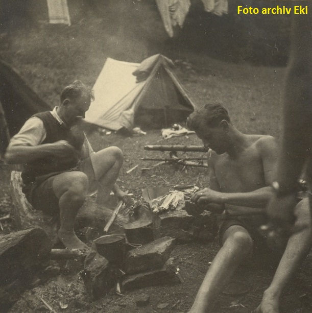 Děda rozdělává oheň na vodáckém tábořišti u Nežárky 1944