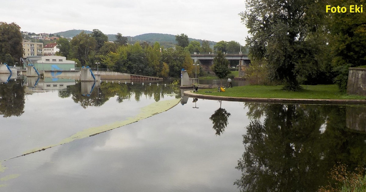 Klidná hladina nadjezí vysokého jezu v Berouně