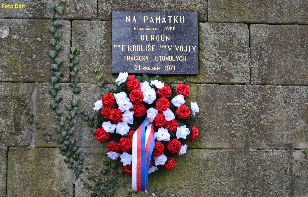 Dva z hasičů při záchraně zahynuli. Berounští hasiči si jejich smrt dodnes připomínají umístěním věnce k pomníčku. Za fotku a upozornění na objekt děkuji Danovi. Pomníček upomíná na fakt, že riskováním na jezu neohrožujete jen sami sebe. Druhé připomenutí – i zachránce se může dostat do smrtelného nebezpečí. Při záchraně tonoucího buďte opatrní. Používejte raději záchranné prostředky.