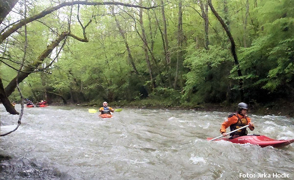 a v závěru objedeme skalku zleva. Dál se řeka postupně uklidňuje a po dalších 3 km jsme na soutoku s řekou Žirovnička. Máme za sebou 8 km vody WW II – III se 3 úseky poctivé čtyřky. Přidávají se ostatní, je víc vody, řeka je širší, asi po 2 km v zablokovaném balvaništi nestihnu zatočit doleva a po nárazu do balvanu a pokusu o scouvání nás převrhne silný proud a plaveme. Pár ran do nohou a jsme s lodí u břehu. Materiální ztráty žádné. Řeka je dál lehčí, peřeje jsou tvořeny kamenitými a štěrkovými lavicemi a rozšiřuje se místy až na 50 m. Občas zazlobí padlý strom v proudu. Asi 4 km před koncem naší plavby se údolí Radiky opět sevře a obtížnost poněkud zvýší. Končíme na soutoku s Malou Rekou, máme za sebou 25 km krásné horské řeky.