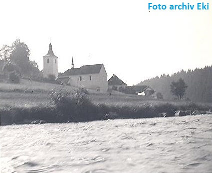 Na delší vodáckou výpravu se vydal děda s babičkou 5. srpna 1938. Pluli z Červené do Prahy. Babička to tu měla moc ráda. Považovala místní kostelík se zvonicí za jeden z nejkrásnějších na světě. Taky milovala Červenské proudy, které tady začínaly (viz třeba článek). Popisovala, jak si je jednou v létě celé proplavala (tedy dobrovolně, nikoli kvůli cvaknutí), samozřejmě pod dohledem dědečka - zkušeného kormidelníka blízké kánoe.