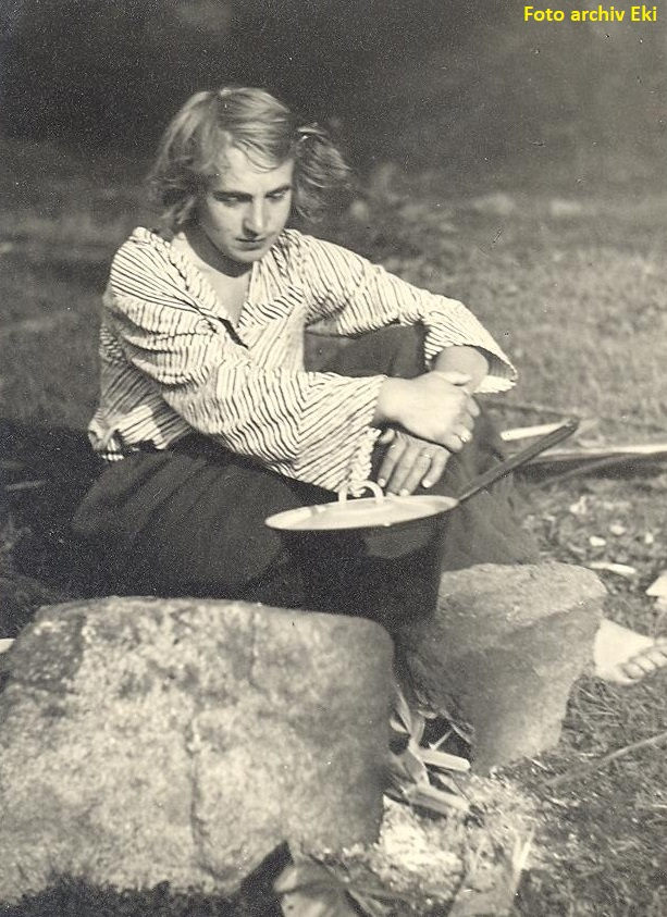 Příprava vodácké snídaně u Vltavy v roce 1938