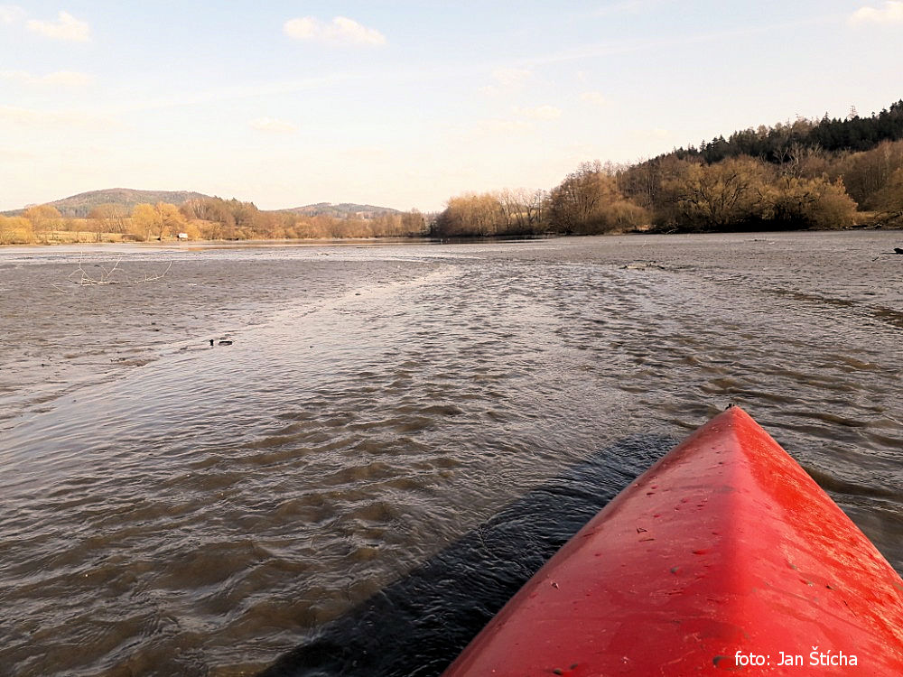 Po půl druhé hodině od vyplutí jsem dosáhl soutoku s Blanicí. Je zvláštní vplouvat do malé úzké říčky a přitom se najednou cítit volně na "velké" řece. Několikrát jsem tenhle soutok navštívil v minulosti a nevěřil jsem, že až sem dopluji po vodě. Dnes to prostě šlo. Cestu do Louňovic blokovala na Blanici jen jedna neprůjezdná hráz větví a stromů (VR6), která se dala lehce přenést a dále pak mnoho vody zadržující nesjízdný jez. Dle vodočtu měla mít Blanice 122cm.