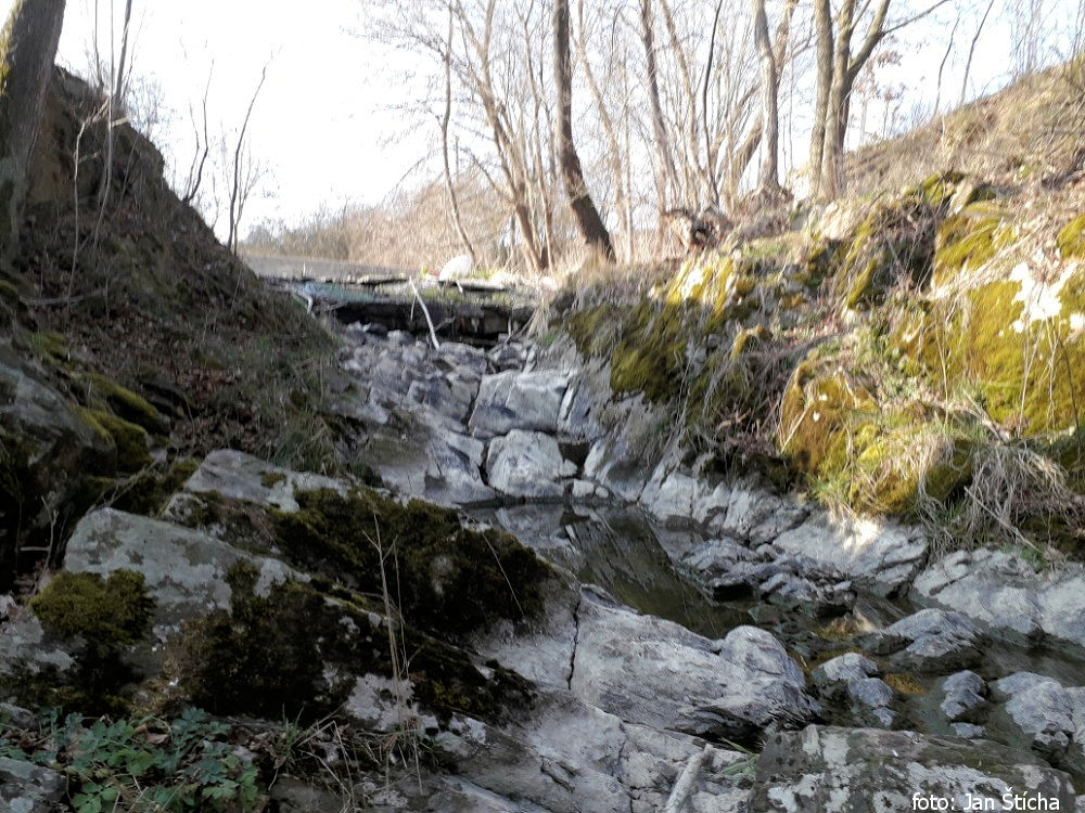 Zpátky ale k cestě po proudu. Potok se klikatí mezi zahradami a stráněmi a hned na prvních asi 100 metrech je nutné překonat 3 lávky nebo jejich torza, které nelze podjet. V džungli trav a kopřiv je potok překvapivě průjezdný hlavně díky vzdutí rybníka Strašík. Přišlo mi však krajně podezřelé, že zde bylo výrazně méně vody než jsem zvyklý, a když se přede mnou objevila hladina rybníka, došlo mi, že ho právě vypouštějí. Vody v těchto mělčinách tak tak stačí za normálního stavu k proplutí, ale dnes bylo ještě hůř. Nelze to ale vzdát; rozpůlil jsem pádlo a odpichoval se jako invalida v asi deseticentimetrové hloubce, kde potok srandovně vlnil drobným proudem až k mizející vodní ploše polovypuštěného vodního díla. Když jsem se dosoukal do stojatých vod, mohl vyzkoušet, jaké je to po dvaceti letech jezdit v kajaku. Tentokrát ale v MÉM prvním (laminátovém) kajáčku.