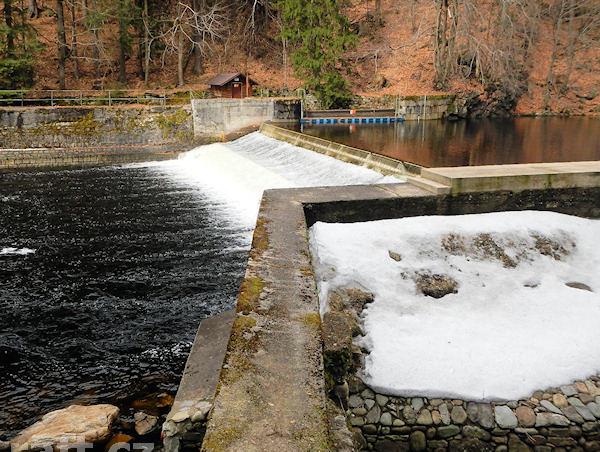 r.km 79,5 Jez Turnov má na pravé straně rybí přechod, po roštech nad ním lze přenést loď, 11/2023