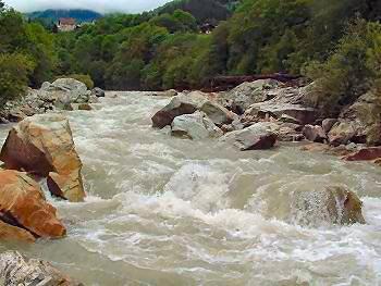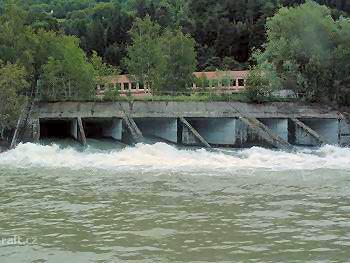 Bezprostředně za silničním mostem pod Trun-em vytvořil jeden z přítoků katarakt WW IV+. V levé části ...