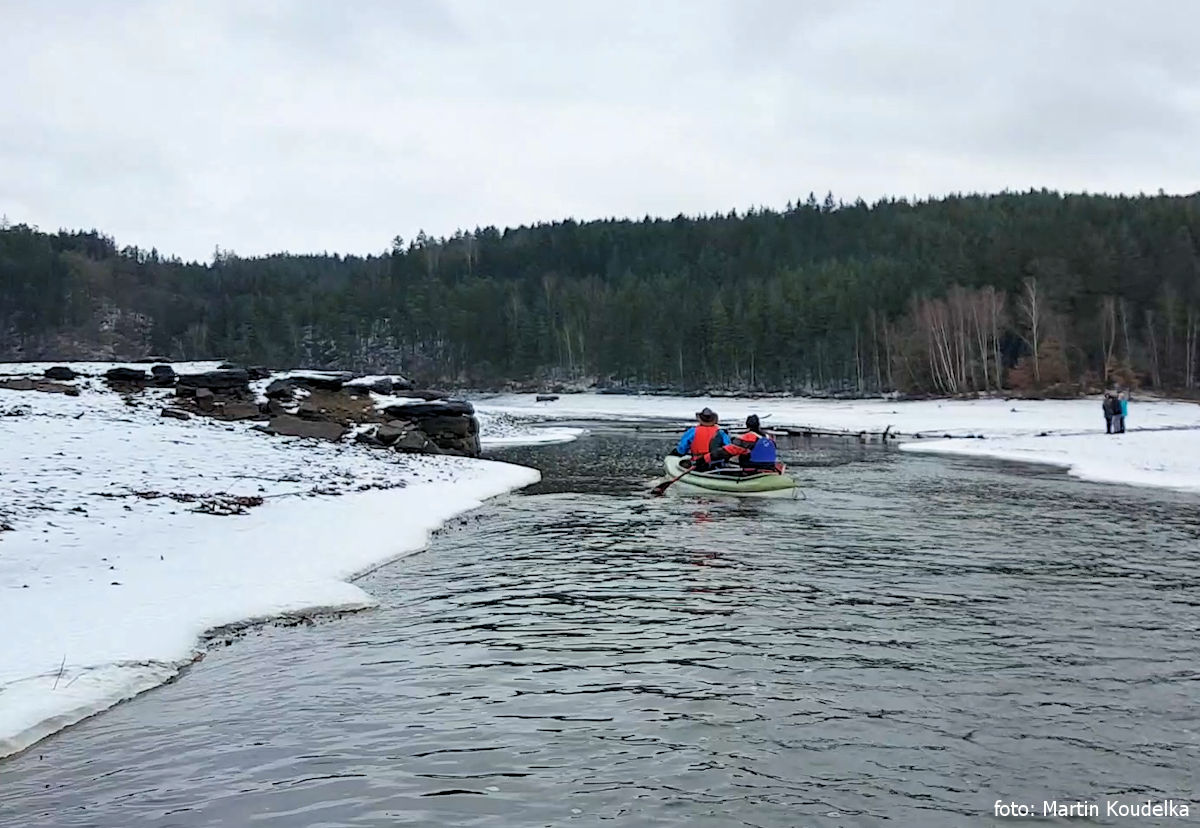 Jez ve Strážné přetahujeme přes most, který je těsně nad ním a od jezu až ke vzdutí přehrady České údolí začíná jeden nekončící volej, jehož splutí si zpestřujeme nájezdy do ledu na březích řeky. Dojíždíme k jezu pod Liticemi, který má u pravé kozy sjízdnou šlajsnu. Pak podjedeme most silnice na Litice, za kterým narážíme na zamrzlou přehradu. Plán přepádlovat přehradu odpískáváme a hlavním úkolem je prorazit ke břehu. Lodě s dvojčlennou posádkou střídavě metr po metru prorážejí krustou ledu cestu, kde čeká auto s vlekem a teplým borščem pro posilnění.