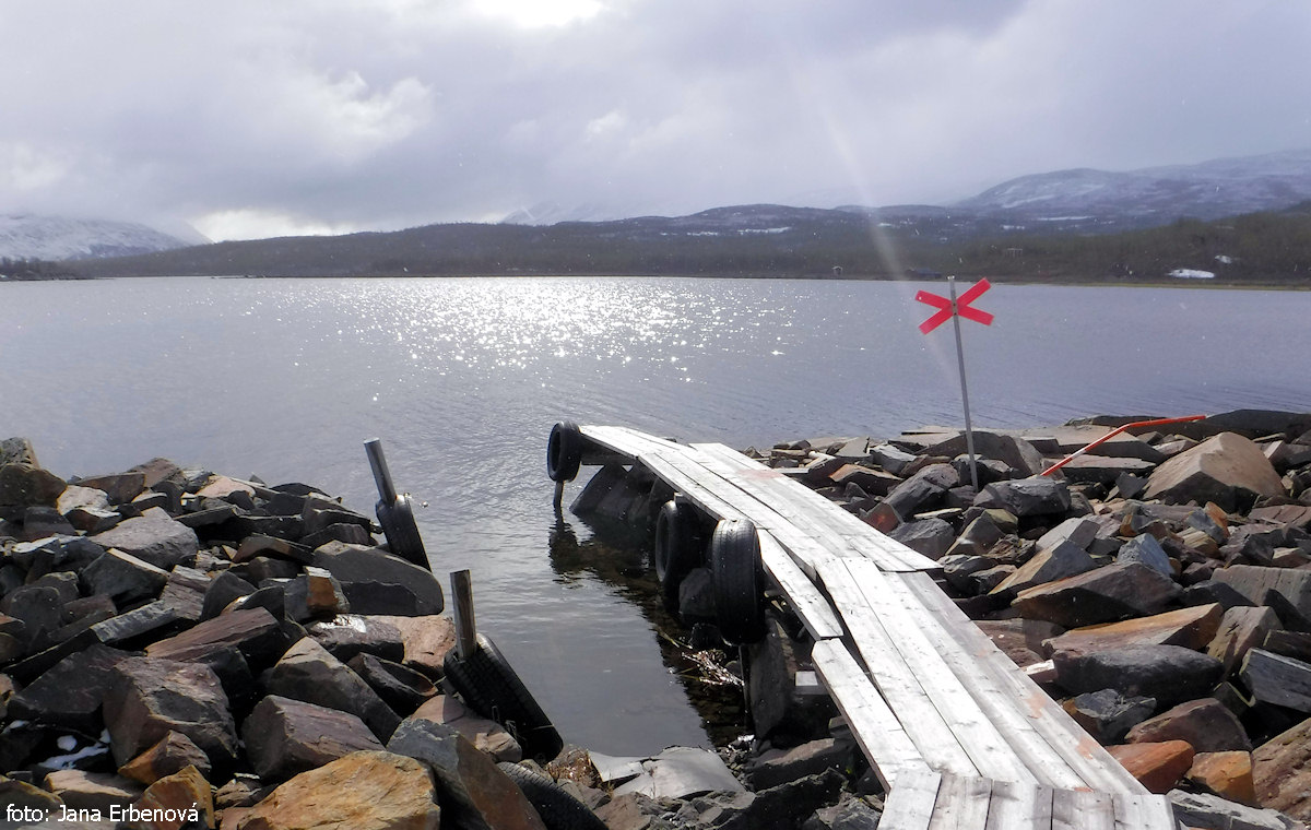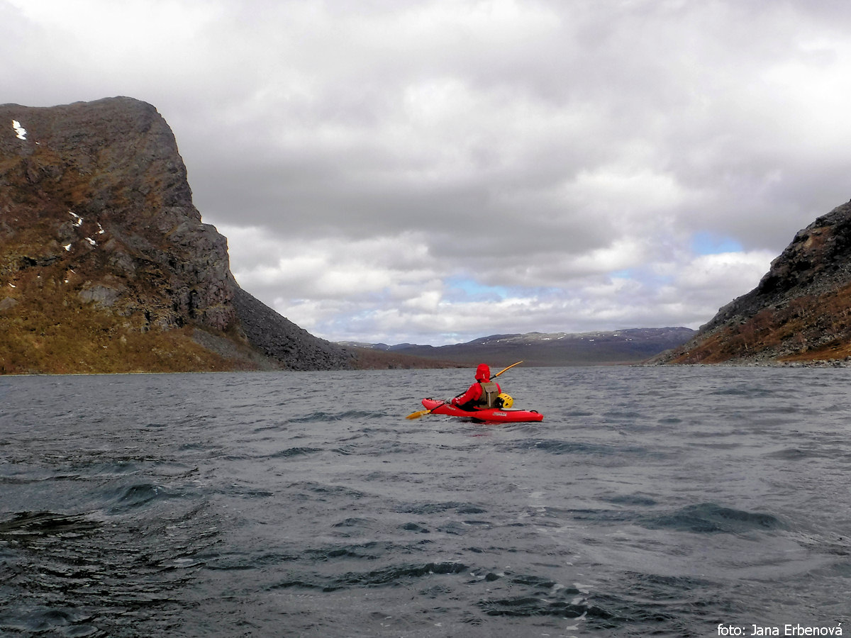Po té Martinové splouvají tříkilometrový úsek v kajacích nalehko a užívají si panenské vody s pocitem, že mnoho vodáků tady ještě nebylo. Já si kajak odnáším na zádech až k jezeru Kaitumjaure. Vyrobila jsem si na to superspeciální postroj – koupila jsem si v Liedlu za tři stovky batůžek s dobrým polstrováním zad a našila na něj laciné popruhy. Kajak, který je dlouhý 310 cm, jsem na batoh upevnila na široko. Na volné planině se nesl dobře, horší to pak bylo na cestičce lemované břízkami.