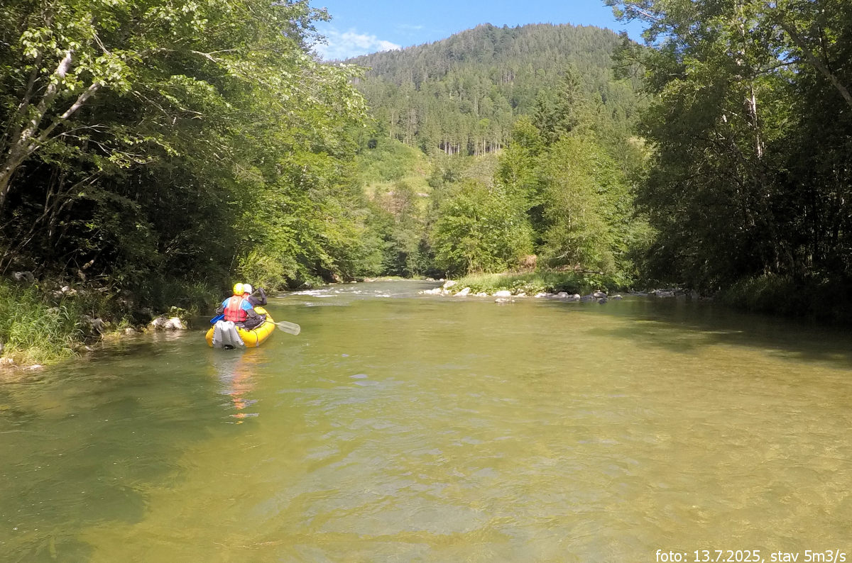 Po splutí Schwarzy a Muru s proložkou feratového lezení kousek od výstupního místa na Muru, se druhý den přesouváme k horní Salze. Jako na předchozích dvou řekách, kde bylo vody málo, se obáváme, jestli bude úsek vůbec sjízdný. Jedeme po silnici po proudu řeky od Gusswerku až k mostu, kde širší údolí se začíná více zužovat a skály se přibližují k řece. Na parkovišti u silnice, kde je i pěší most, necháváme auto a vyplouváme. Vodočet hlásí sotva 5 kubíků, což na 13. července je poměrně dobrý stav, ale je to stav opravdu minimální.