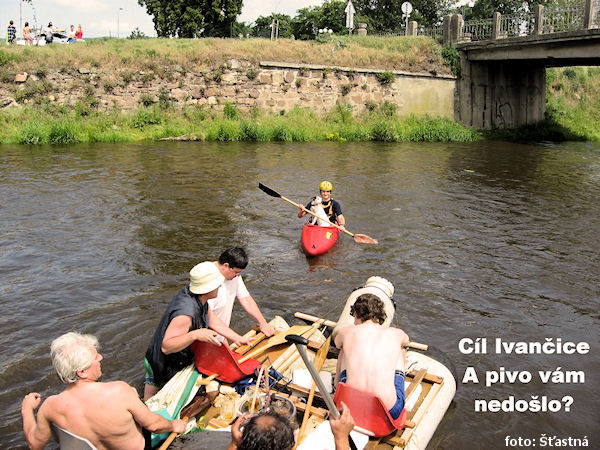 My, kteří jsme loď nerozpárali jsme vesele pokračovali dále. Euforie, hrdost a povznesená nálada (někdy i podpořená alkoholem) však brzy opadla. V první zatáčce čekal spadlý strom, který protřídil „znalé“ od „zkušených“. Kdo nezvládl rychle projet úzkým průjezdem kolem větví vlevo těsně u břehu, byl nemile překvapen. Zvláště rafťáci, kteří chytře obnesli minulý jez a na tento klidný úsek odložili volně do lodi nepotřebné vesty a helmy (pokud nějaké vlastnili), měli problém. Pokud neměli rychlé reakce, čelný náraz na kmen hrudníkem a následné protažení pod ním asi nebyl příjemný. Pro ty, kteří rádi zachraňují, úplný ráj. Téměř každý druhý raft havaroval, po břehu pobíhají zachránění, jejich zachránci, děti, psi, kolem plavou pádla, různé vodácké potřeby... Prostě masakr na závěr. Kdo našel pádla, pádluje dále. Už jen schůdek přes betonové pláty (normálně přechod pro pěší). Přítok zprava z továrny v Alexovicích (poslední šanci se vykoupat mají ti, kteří na kajacích a deblovkách neznají náklony) a poslední spadlý strom, který se dá prorvat větvemi. A už je tu soutok s Oslavkou (pro Moraváky), jinak s Oslavou pro cizí a vpravo už velké vodácké hemžení před mostem v Ivančicích.