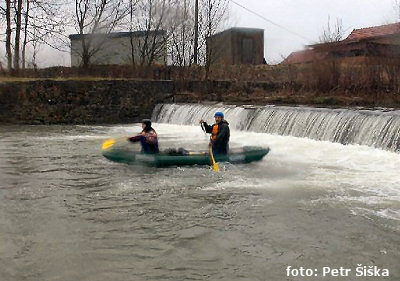 Ale zpět k vodě. Na ni jsme se dostali ve 13:00 tedy v době, kdy jsme očekávali nejsilnější sluneční paprsky. A vydali se po proudu směrem ke Vsetínu. Cesta nám příjemně utíkala a voda celkem tekla. Časté splávky, prahy a peřeje byly úžasným zpestřením. Nezapomenutelné byly i kolmé jezy. Jeden z nich jsem sjel pozadu, to aby se Borek moc neumáčel studenou vodou. Naši expedici ze břehů sledovalo domorodé obyvatelstvo a jejich zkoprnělé až nechápavé výrazy nás ujišťovaly, že do těchto končin moc cizinců asi nezavítá. Na důkladnější sblížení a sledování způsobu života však nebylo moc času. Zejména proto, že Borkovi, ač byl navlečen od hlavy až k patě v neoprenu, začala být zima. Zprvu jsem si myslel, že se mu jenom nechce pádlovat, ale jeho výraz tváře mluvil za vše. Dokonce i přestal mluvit, což zas tak špatné nebylo. Navíc se pomalu začalo stmívat a tak jsme kopli do vrtule, tedy do pádel, a zdolávali kilometry peřejnatých vod směrem k domovu, ku Vsetínu.