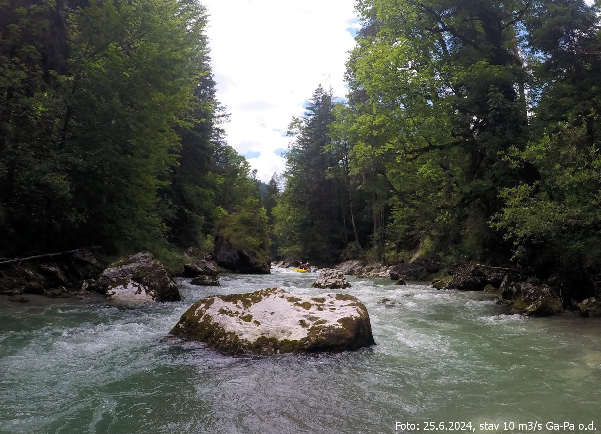 Byli jsme už dopředu varováni od jiných vodáků na parkovišti, že hned v úvodu za prvním velkým kamenem je strom, který se dá vlevo objet. Na něho brzo narazíme a jen s obtížemi se pod jeho větvemi proplétáme, protože jsme nestihli zajet úplně doleva. Další strom následuje vzápětí, ale je za našeho stavu dostatečně vysoko. Dále už je to vše čisté, ale přeci jenom jeden nikdy neví. Za velké kameny není mnohdy vidět, a tak najíždíme často přes pomocné vracáky, abychom alespoň nějak prohlédli.