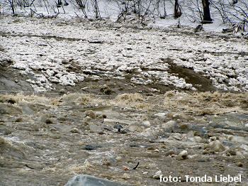 Nasedáme v Brankách skokem do navigace. Voda pěkně hnědá neprůhledná, ale proud v pohodě. Koryto široké 4 až 6m. Za posledními domky v Brankách je splávek, který spíše tréninkově odjistíme. 2 až 3 km pohodové jízdy. Prostě konečně na vodě! Jedno zablokované místo přenášíme. Asi po pás ve sněhu. Začínají pěkné meadry. Pak se koryto zúží na 2 až 4 m, proud ještě mírně zrychlí, všude okolo plno větví a meandry točí pěkné 360.