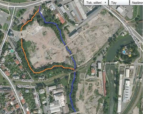 Projíždíme parkem a náhon klidně teče. Náhle vidím před sebou silniční most. Voda nabírá na rychlosti a stáčí se lehce doleva. Vpravo je nějaká menší náplava a vlevo něco kouká pod vodou. Sesouvám se pro jistotu ze sedačky, nohy strkám pod sedačku a zaklekávám. Houkl jsem na Petra, ať lehce přitáhne a namířil to mezi náplavu a překážku.