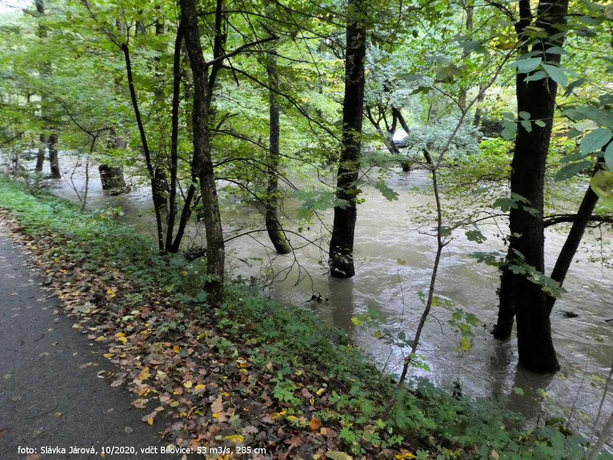 Svitava má délku 97 km, plochu povodí 1150 km2, spoustu jezů, ale jen jedinou přehradu na přítoku Křetínka. Když přišly minulý týden podzimní deště, Svitava se vylila z břehů. Kombinace vodou nasyceného povodí, nemožnosti ovlivnit průtok zadržením v přehradách a pravděpodobně i předchozí vypouštění rybníka v Jedovnici způsobila divadlo nevídané v Brně často. A tak vám nabízím pohled na brněnské jezy při průtoku 53 m3/s (stav 285 cm). Není to zas tak moc, na Svitavě to odpovídá dvouleté vodě. Kulminace 72 m3/s (skoro pětiletá voda) přišla v noci ze 14. na 15.10.2020, tu jsem nestihla. A na závěr přidávám i fotku jezu na Svratce u Olympie, který je jen 200 m nad soutokem se Svitavou, za shodného průtoku 53 m3/s na vodočtu na Poříčí. Ten byl ovšem již řízen Brněnskou přehradou.