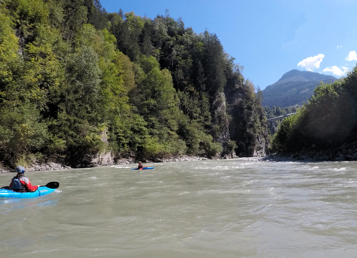 Pod Lendem mírně klesá obtížnost, ale stále je to velmi hravé, vlny jsou pěkně houpací a my už pomalu vyhlížíme výstupní místo. Je na levé straně, kde končí vysoké břehové zdi, a po kamenech se dá vystoupat na parkoviště. Pod ním už se řeka uklidňuje a následují dlouhá vzdutí s jezy. Na další úsek se proto musí přejet auty až do Wefenu, ale o tom příště.