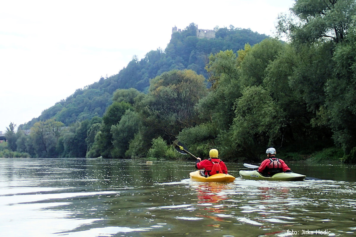 Idylku poněkud narušuje hluk z nedaleké dálnice. Pod jejím mostem se Váh zúží a my můžeme potrénovat přejezdy v šikmých vlnách. Tady už místa na pauzu téměř nejsou, buď se vpravo i vlevo tyčí strmé břehy nebo míjíme plácky s bezedným bahnem.