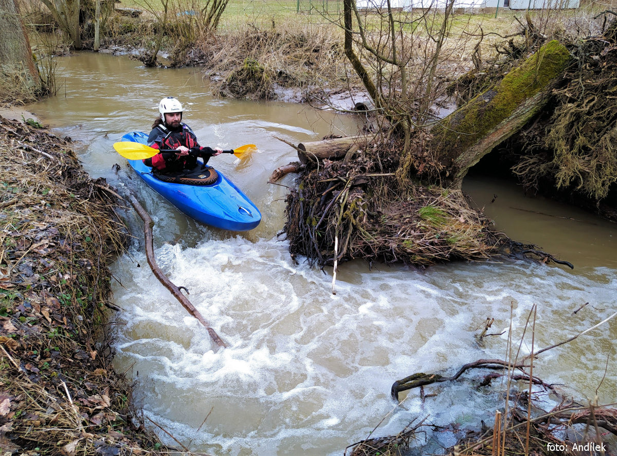 Bohužel nasedat přímo na uvedeném soutoku nyní (stav v únoru 2022) postrádalo smysl. Na nějakých sto metrech byly tři neprůjezdné zátarasy ze spadlých stromů. Díky jednomu z nich nešlo sjet zdejší umělý stupeň.