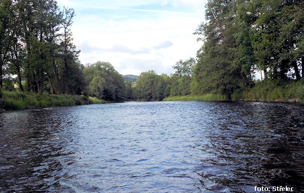 Ráno to z počátku bylo mírně technické, ale pod obloukem za mostem už začalo vzdutí prvního píseckého jezu dlouhé cca tři kilometry. První písecký jez má hezkou retardérku vlevo. Vzhledem k výskytu rybářů jsem se do ní vrhl s pokřikem „Varuj dušu na dolině, drevo ídě!“ Rybaříci v jezu hbitě uhnuli, ti na břehu cca 15 metrů pod šlajsnou s pruty nahozenými do proudnice jen tupě zírali. Vodáka ve čtvrt na devět ráno evidentně nečekali.