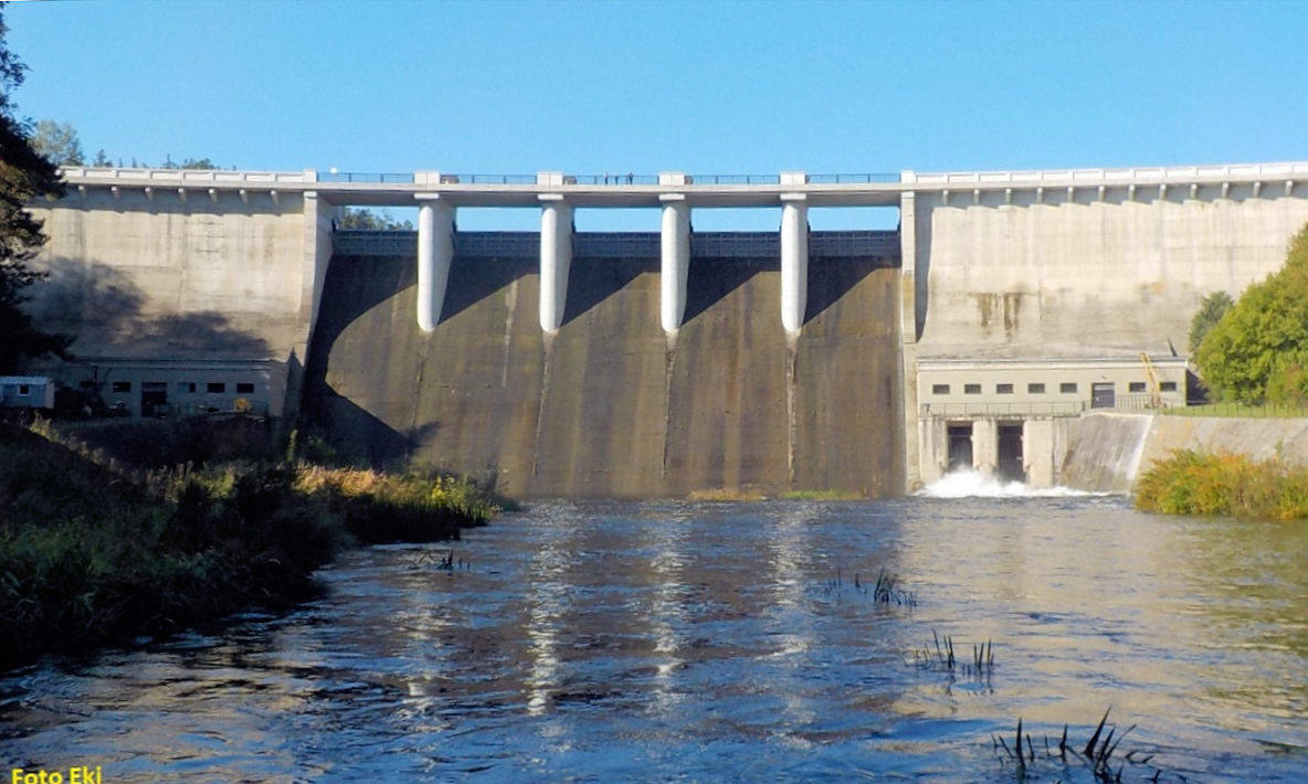 Hráz nádrže Kružberk na Moravici při 13 m3/s (km 45,2)