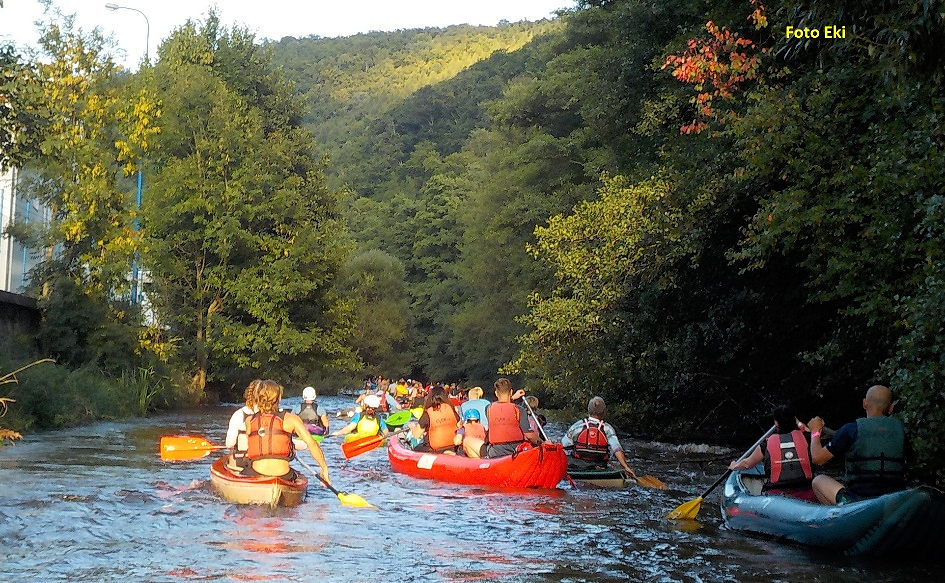 Řeka i dál teče pěkným lesnatým údolím. Na březích se objevují i zbytky po těžbě pokrývačských břidlic. Doplouvám čelo vypouštěné vlny vody. To se pozná podle čiré vody pod lodí, které je náhle příliš málo. Čekání na vodu prokládám svačinkou. Po několika čekáních na dotok vody doplouvám ke kempu Podhradí na pravém břehu. Část lodí tu přistává, část naopak startuje.