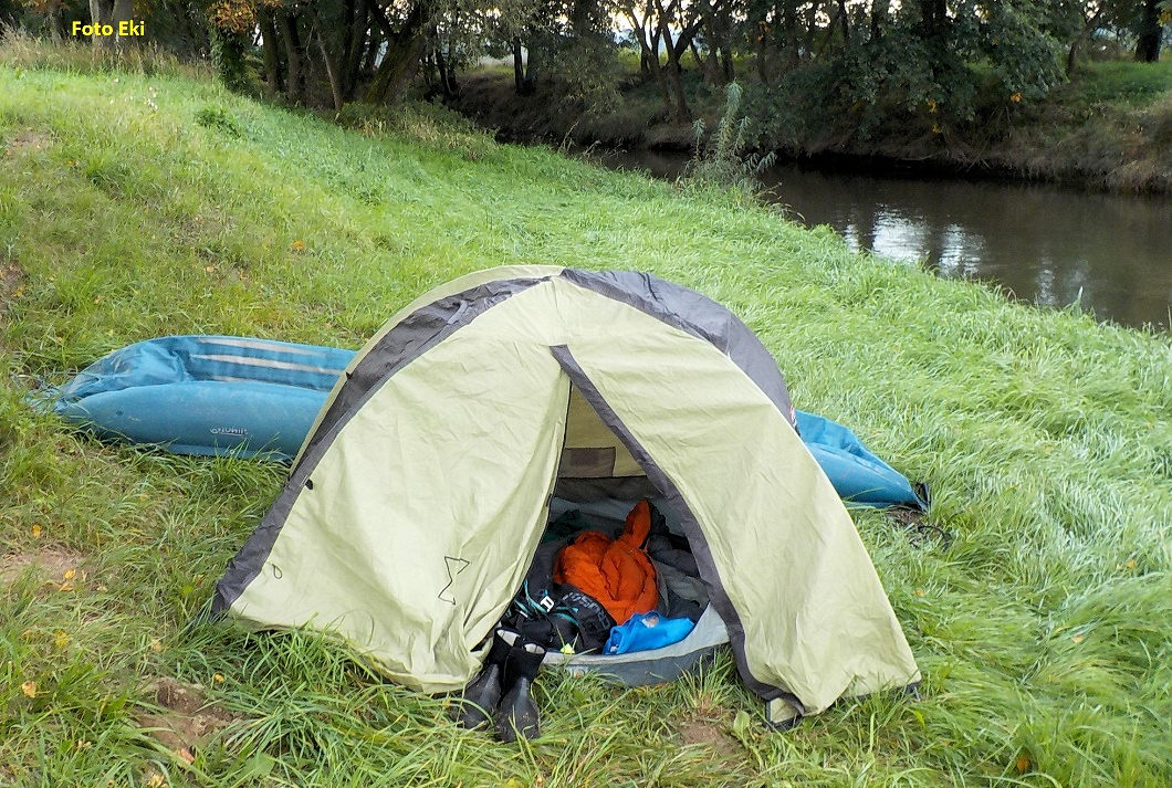 Snažím se doplout co nejdál, protože ráno už nemusí téct dost vody. Míjím proto i k návštěvě zvoucí opavskou restauraci na levém břehu. Stan stavím už skoro za tmy na břehu na louce poblíž místního nákupáku Glóbus.
