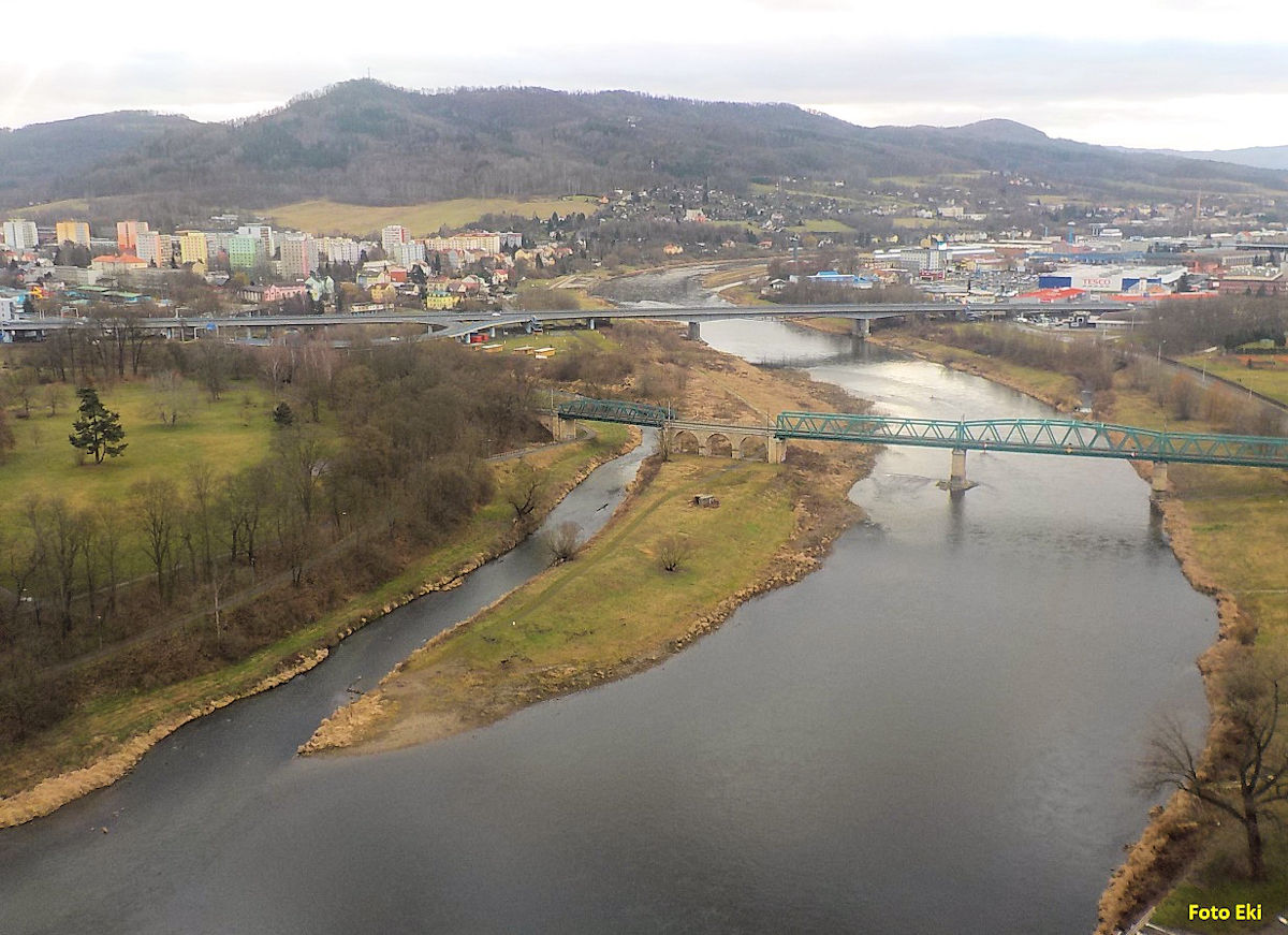 přítok vpravo do Labe na ř. km 95,1 obvyklý konec plavby, na Labi vlevo, (122 m n. m.) vlakové nádraží Děčín hl. n. 800 m vlevo, |
