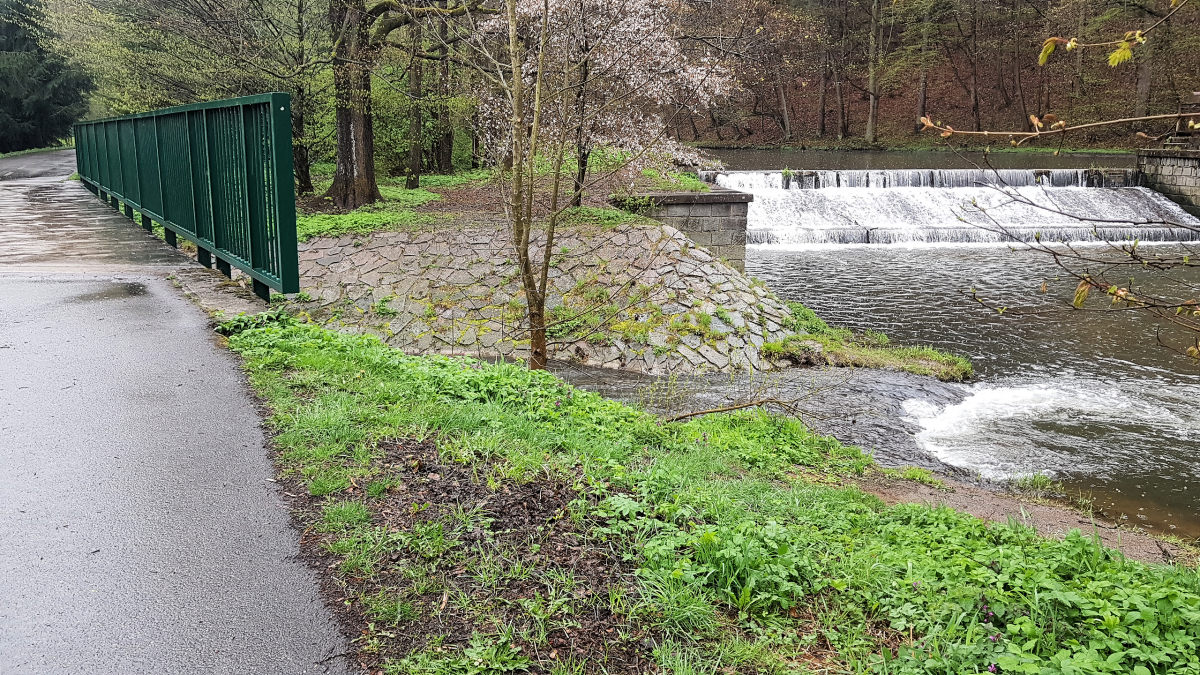 jez (stupeň) vysoký (m) 1,0 !! a následuje za 150 m dřevěný most pěší nebo lávka 0,8 km (GPS: 50.0751492,16.6177025) |