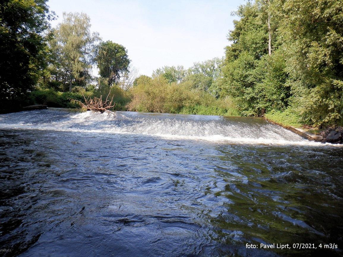 r.km 3,9 Jez Hradiště pevný, přímý jez. Šířka přelivné hrany je 18 m a spád 2,5 m. Nad i pod jezem jsou břehy toku zpevněné zdí.