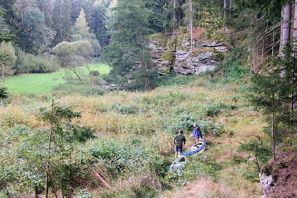 Vyrazili jsme v září 2011 ve třech na dvou laminátkách z obce Kaiserhammer. Po deseti minutách přenášíme první jez. Pokračovat náhonem se nedá, je obklopen vysokými zdmi a koryto vpravo je zcela suché.