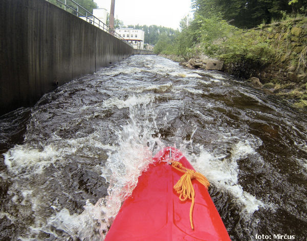 Cirka 3,5 km před cílem je druhý jez, za kterým Nácek zvolní na WW I+. Přijdou pobřežní navigace a fabriky -