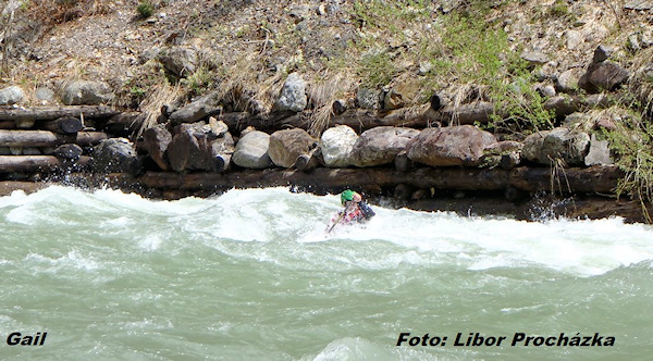 Gail má solidně nakoupeno a online pegel v Maria Luggau hlásí spodní hranici HW, rovných 100cm a 17 kubánců. Při pohledu na sněhová pole v sousedním údolí Lesachtal je jasné, že řeka bude mít ještě hodně dlouho z čeho brát. A většina z nás, letních splouvačů, zná řeku Gail za minimálního stavu splavnosti, kdy se práší za pádlem a není problém v soutěsce včas zastavit před případnou překážkou v podobě padlého stromu, což se však nedá s jistotou tvrdit za aktuálního vodního stavu. A proto se rychle rozdělujeme na dvě skupiny. První silnější skupina volí nasedačku na horním toku pod Obertilliach (odkud to málokdo, kdy vůbec jel), aby prozkoumala úsek WW III-IV se soutěskou až do Birnbaum, kde mezitím nasedá druhá slabší sekce včetně mě na lehčí úsek WW II-III do Kötschach-Mauthen. Vyplouváme a síla řeky se nám okamžitě představuje v celé své kráse. Mohutné vlny a silné válce, kterým se zde naštěstí nechá vyhnout díky už dosti široké řece, která velmi svižně valí do údolí a je pro nás parádní jízdou. Při odpoledním setkání kluci z první skupiny potvrzují, že jsou v soutěsce padlé stromy a jeden přes celou řeku museli obnášet.